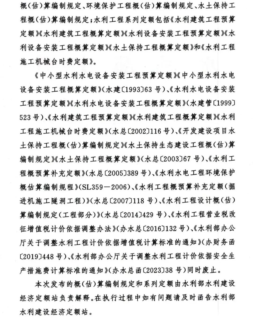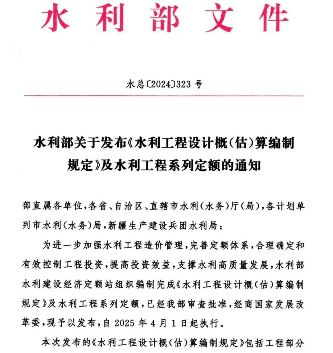 水利部发布《水利工程设计概(估)算编制规定》及水利工程系列定额(水总[2024]323号)