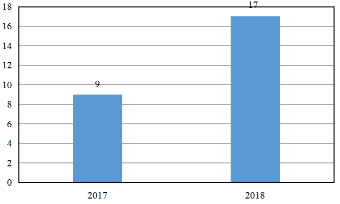 2018 年,试点地方进一步扩大,全年全过程工程咨询新增试点地区为:贵州、宁夏、山东、吉林、河南、安徽、内蒙古以及陕西共 8 个省份,延续了全过程工程咨询的热度。2017 年和 2018 年试点省份数量如图 1 所示,除贵州和山东外均出台了明确的实施方案或指导意见。截至 2018 年底,共计 17 个省份已开展全过程工程咨询的试点工作,其中共 14 个地区公布了相关的试点方案或指导意见。
